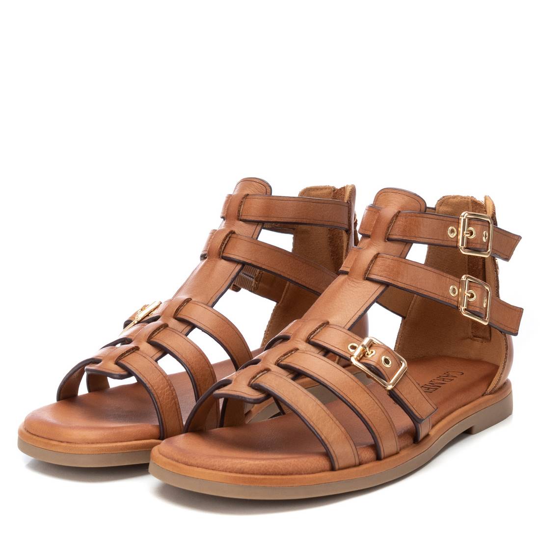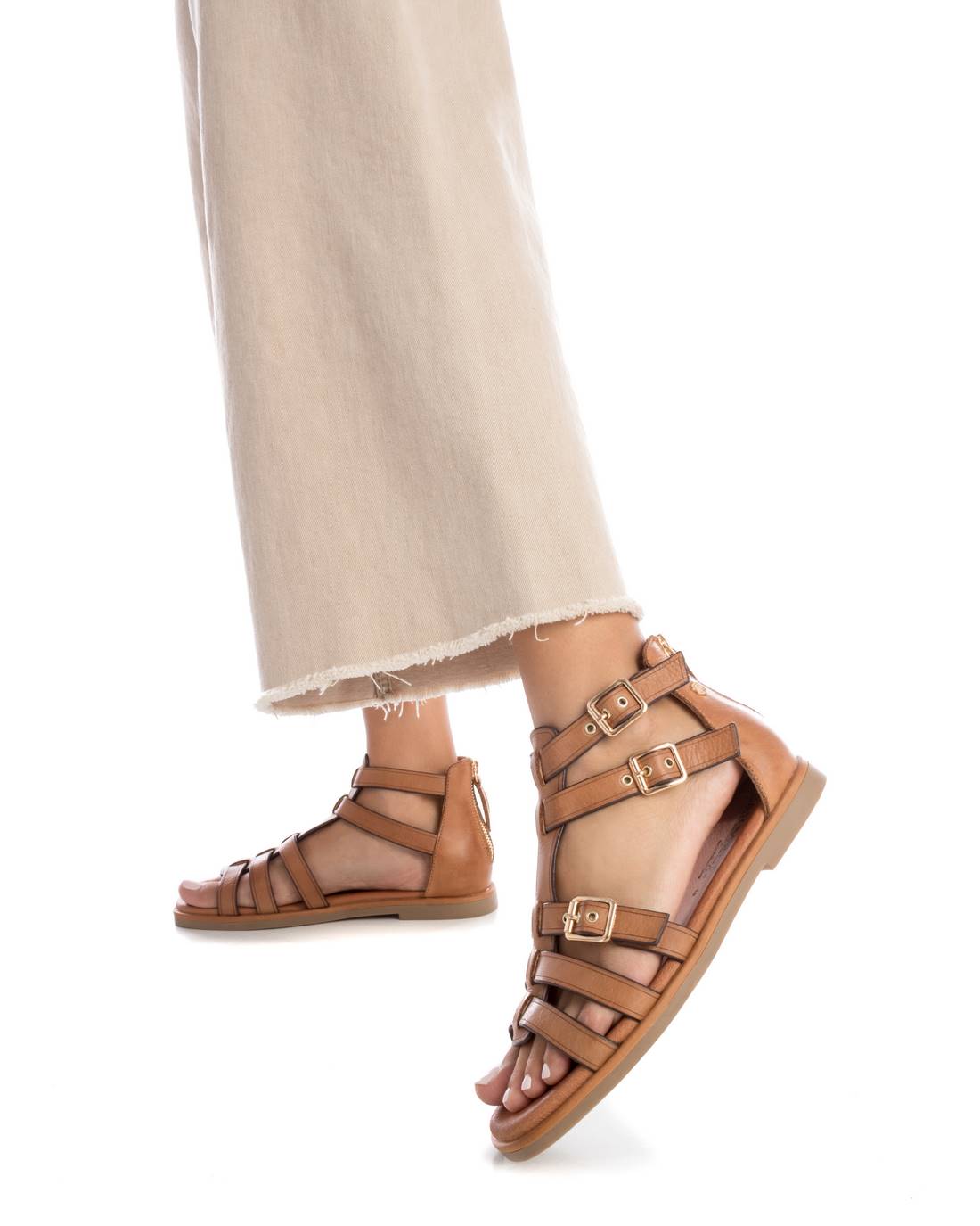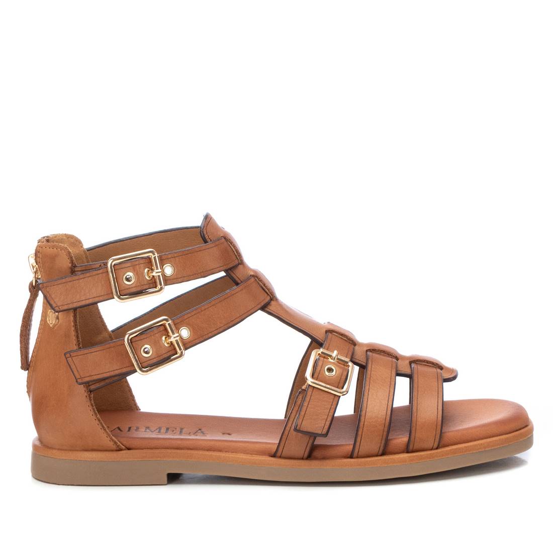 Women's sandals by Carmela. Made of high quality leather. Roman style model with buckles for a perfect fit around the foot. Rear zip fastening. Non-slip rubber sole.