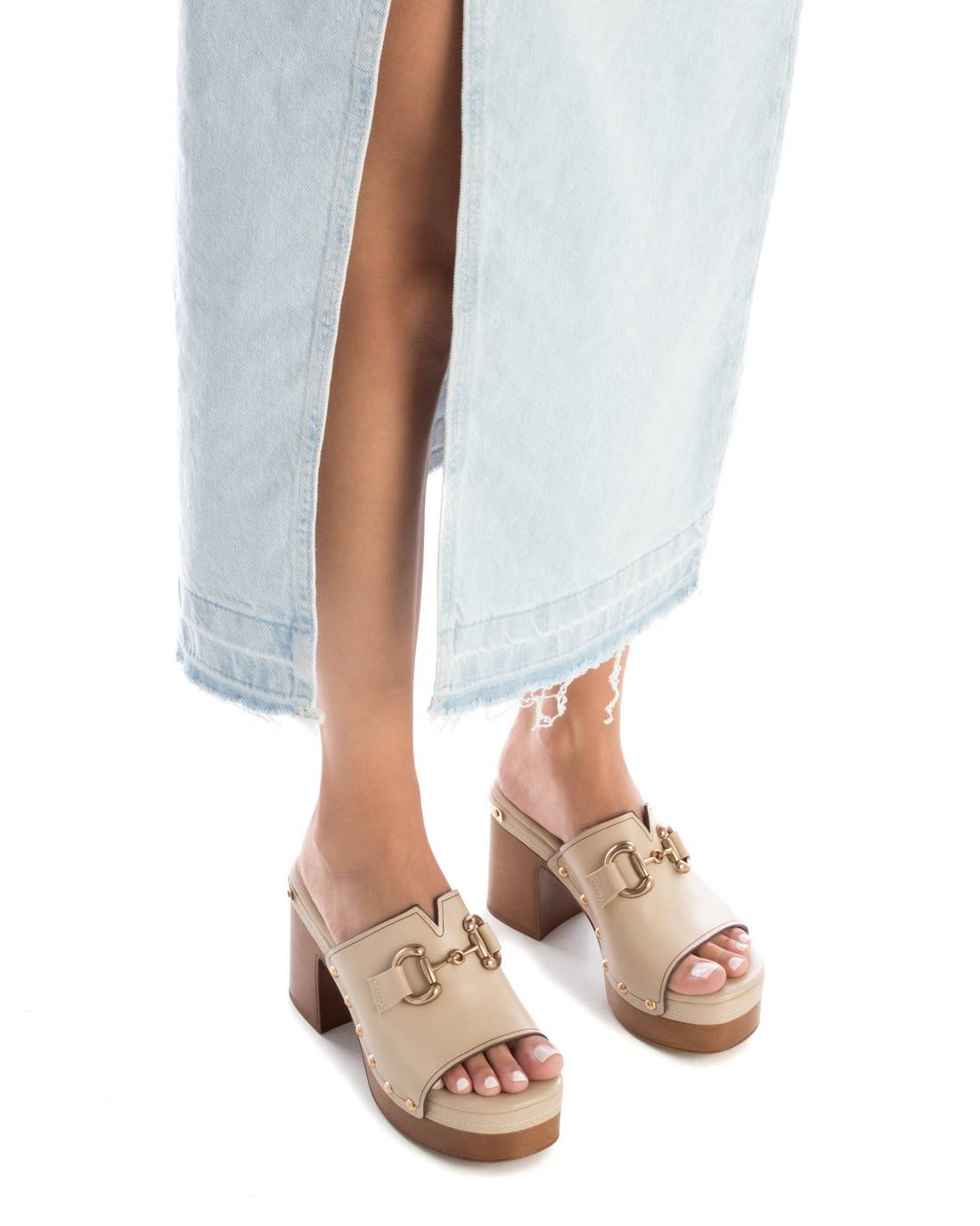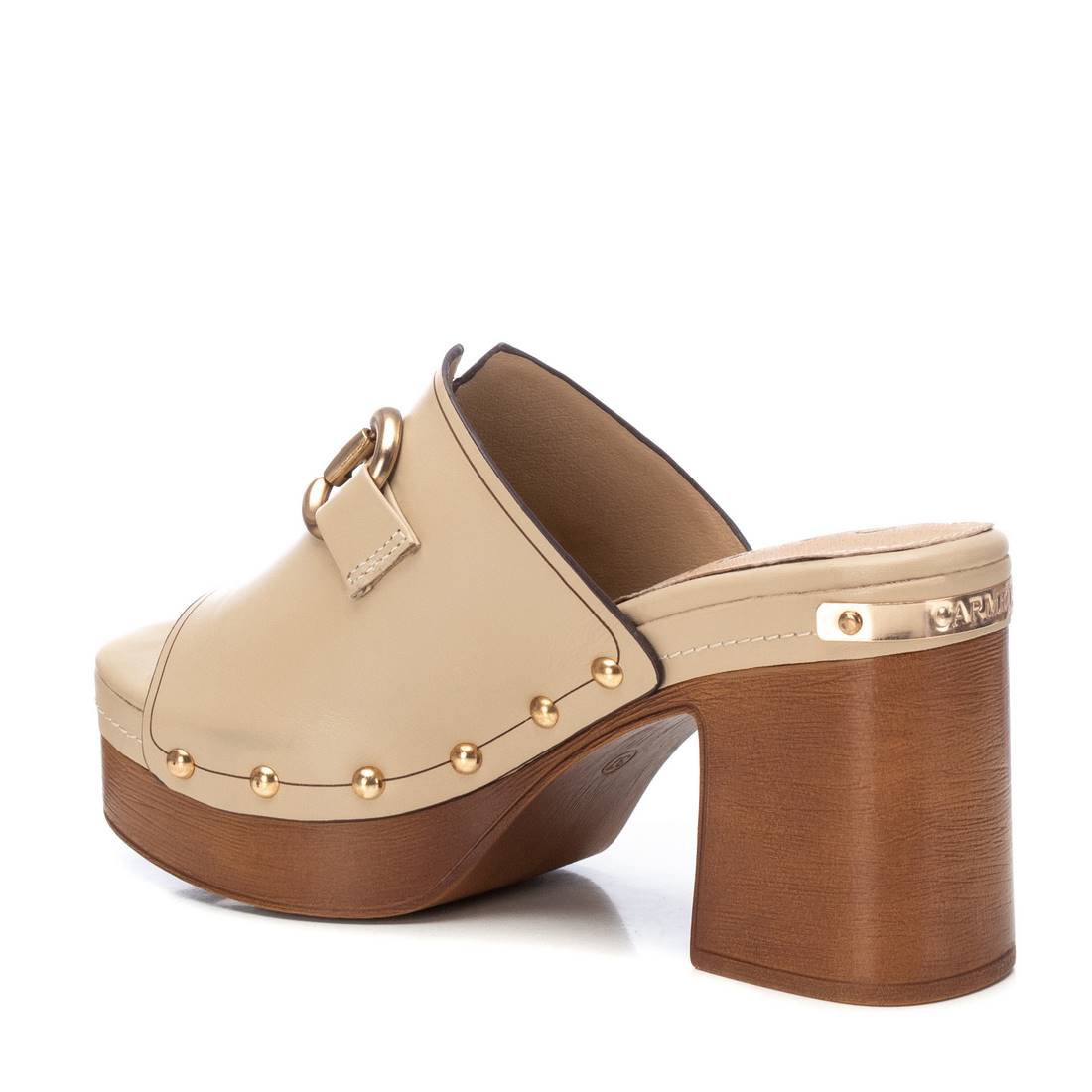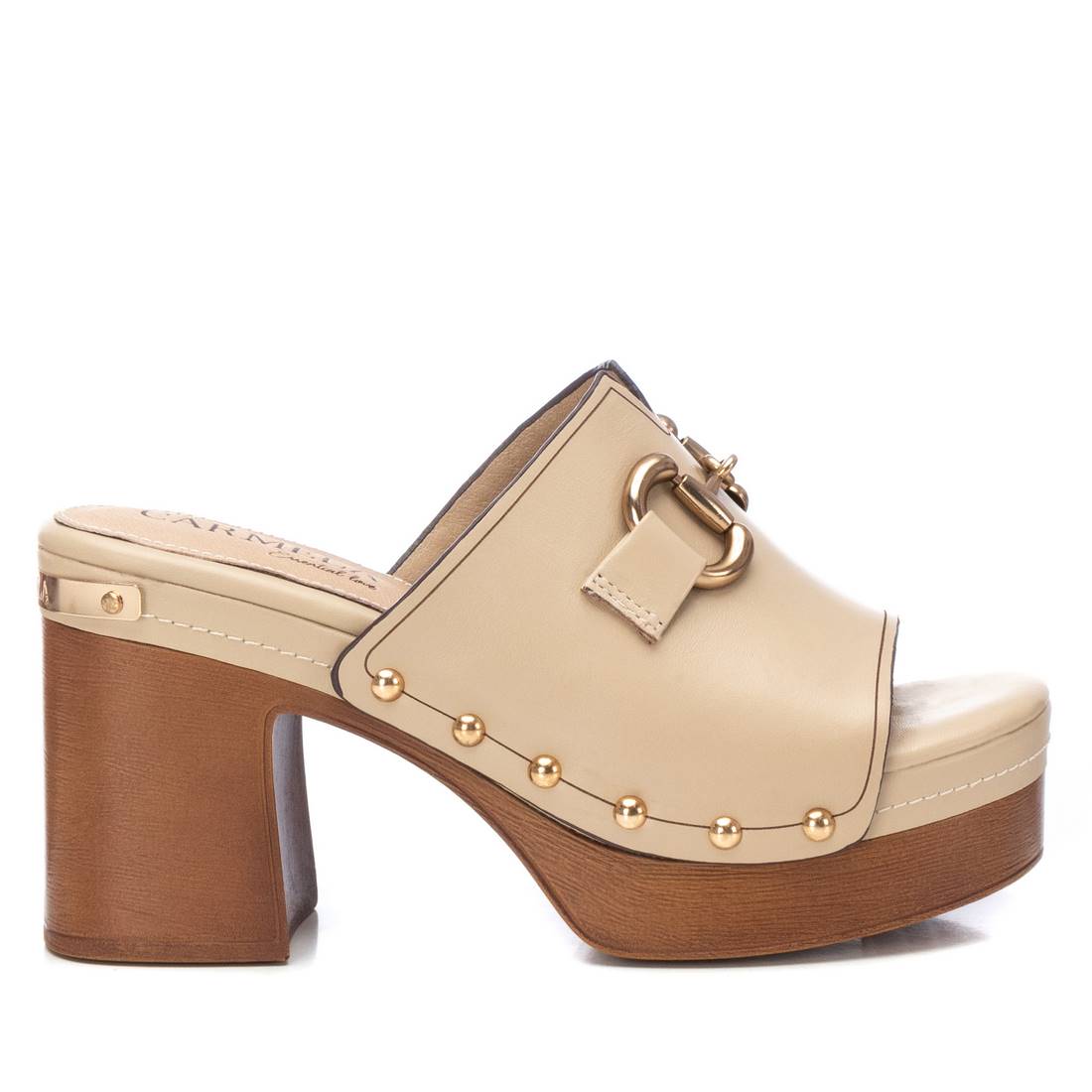 Women's sandals by Carmela. Made of high quality leather. Wide upper with metallic chain on the front. Wide heel of 10 cm with front platform with wood finish. Non-slip sole.