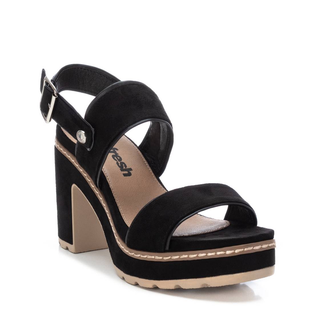 Sandals by Refresh. Made in suede. Buckle fastening. Wide heel of 10 cm with front platform. Non-slip sole. An ideal model for your seasonal looks. This model has been certified vegan by the worldwide organisation PETA (Animal Rights Organisation).