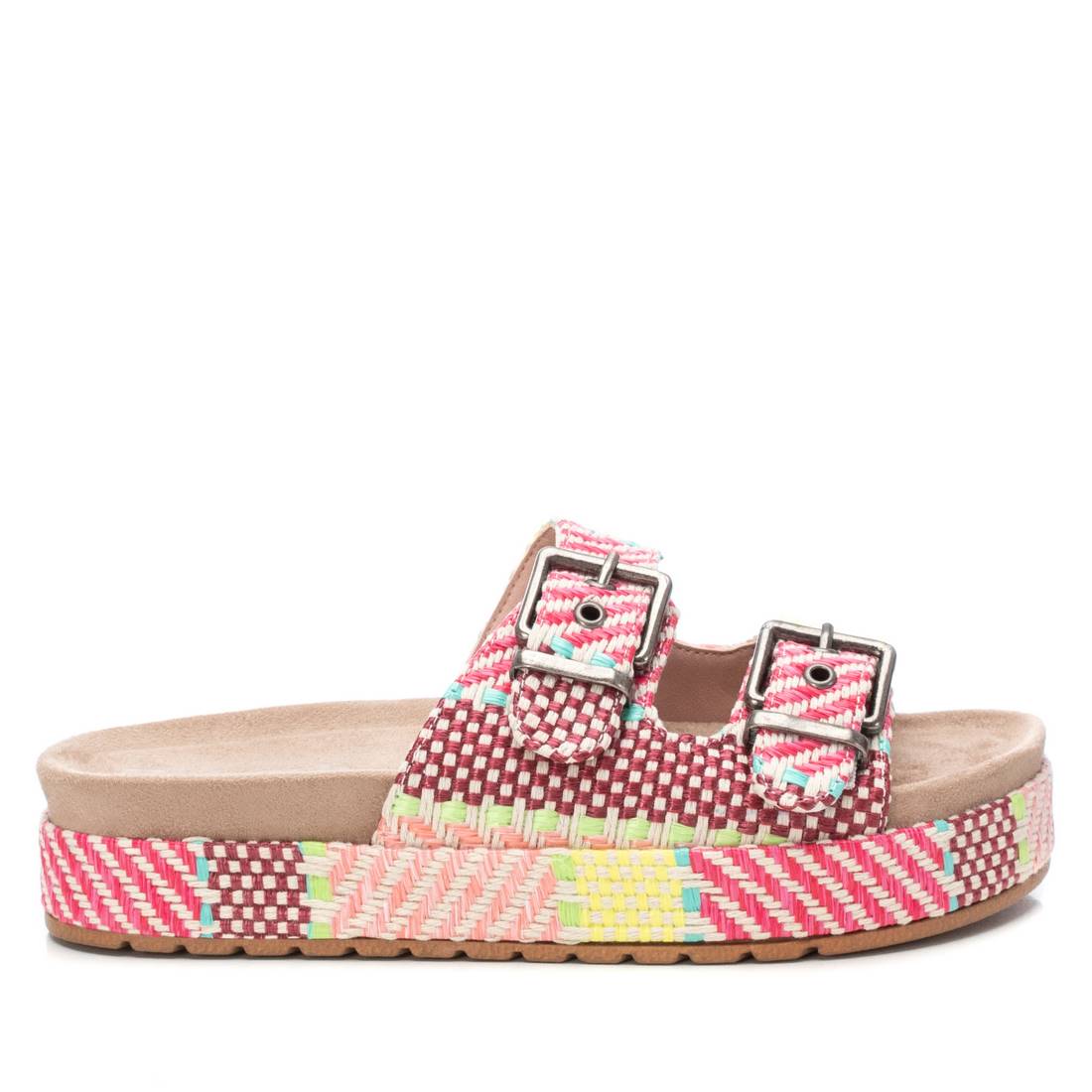 Women's sandals by Refresh. Made in raffia with decorative motif. Platform lined in the same material. Design with two functional buckles for a good fit. Comfortable padded insole and non-slip rubber sole. This model has been certified vegan by the worldwide organisation PETA (Animal Rights Organisation).