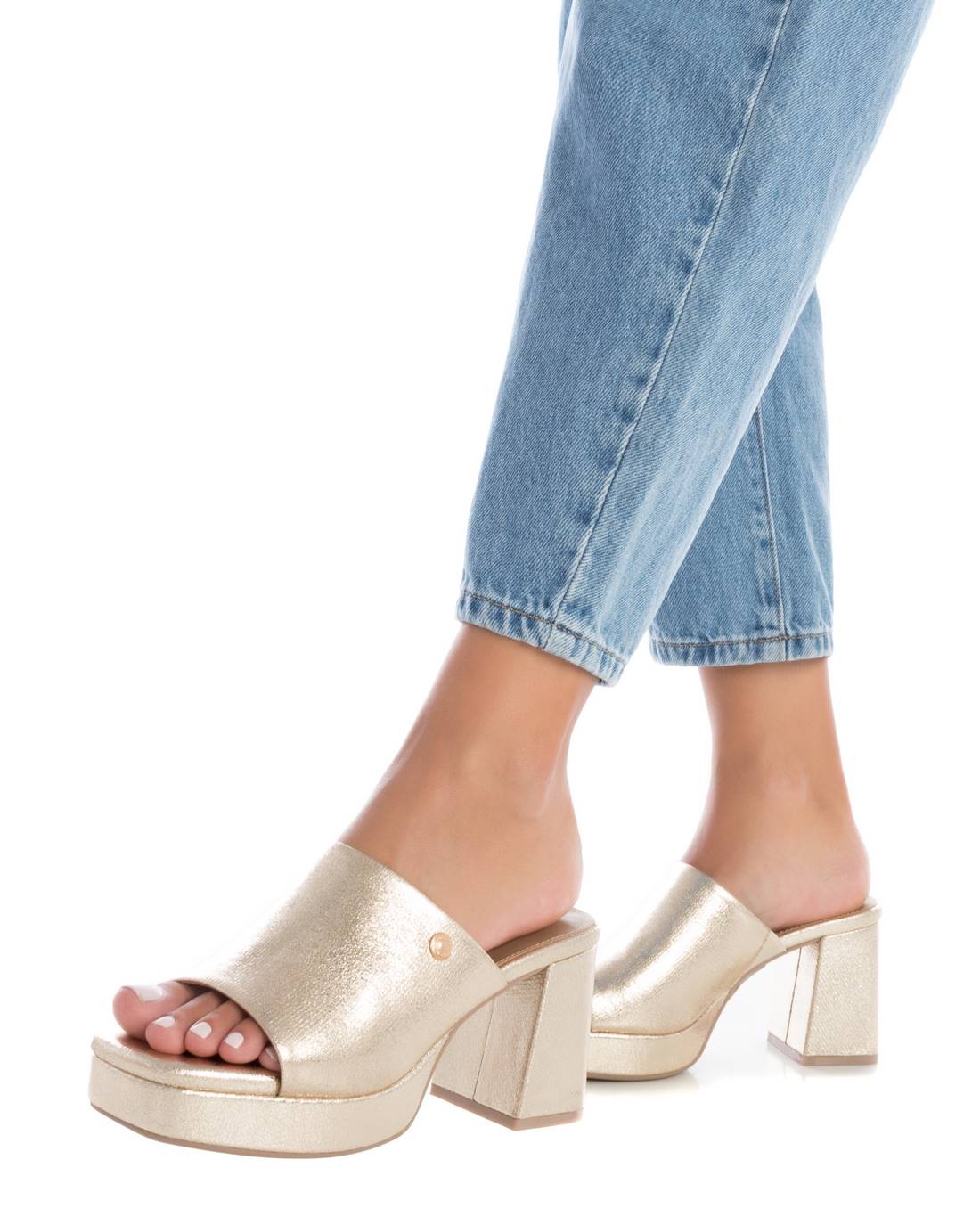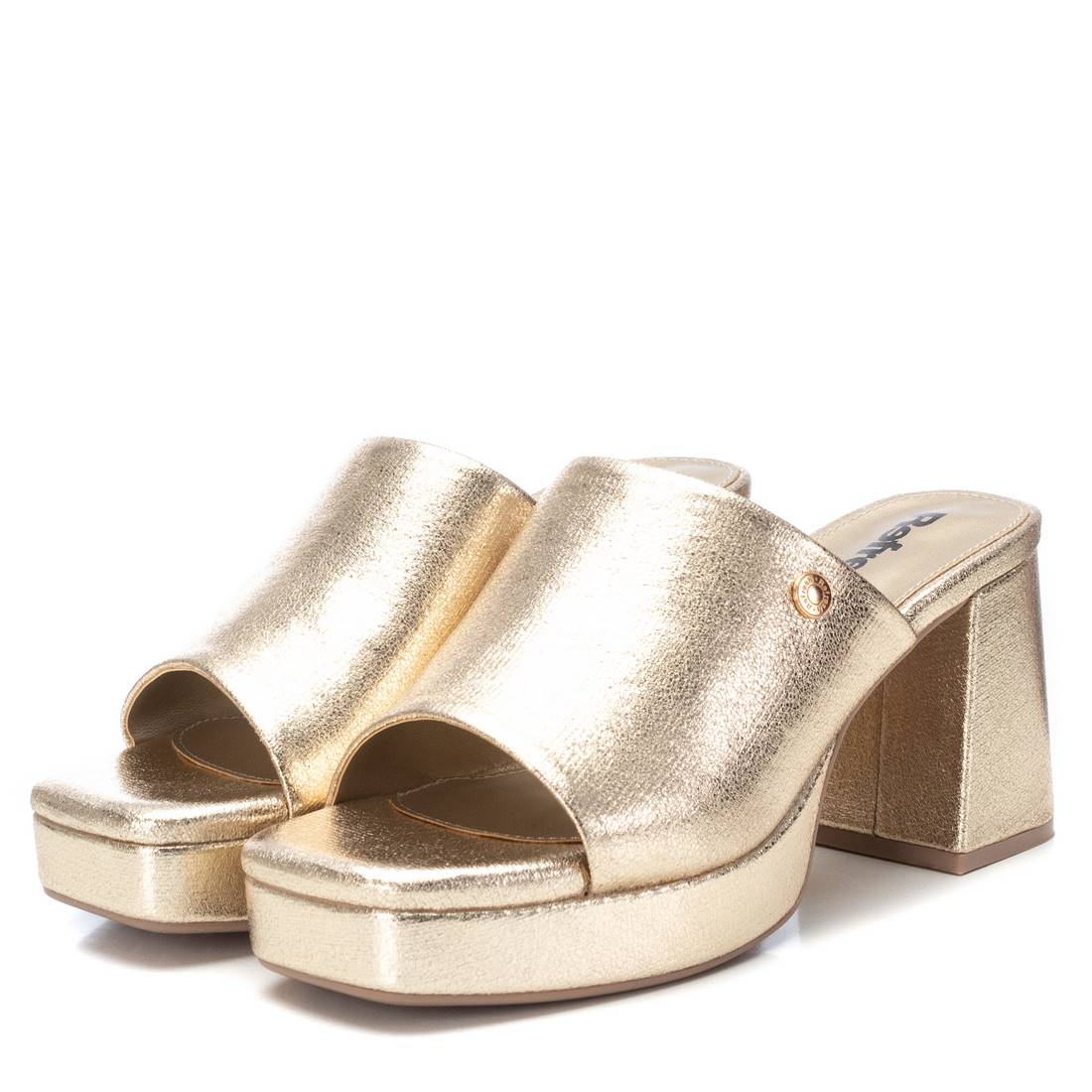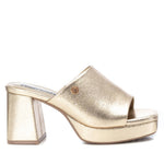 Women's sandals by Refresh. Made in metallic material. Mule type sandal with 8 cm wide heel and front platform for comfort. Dazzle with your party looks. This model has been certified vegan by the worldwide organisation PETA (Animal Rights Organisation).