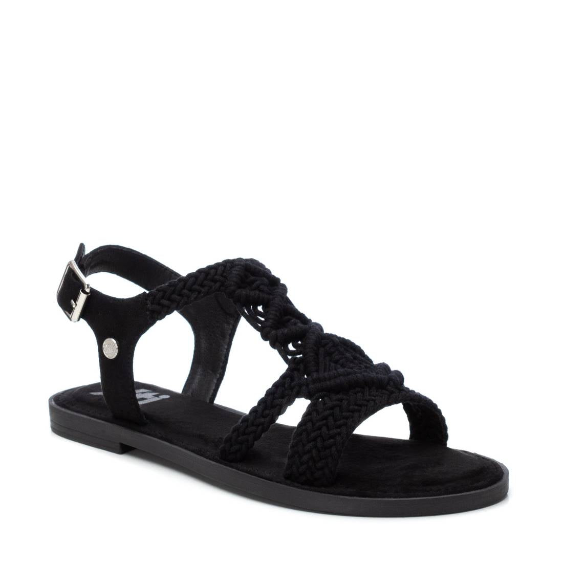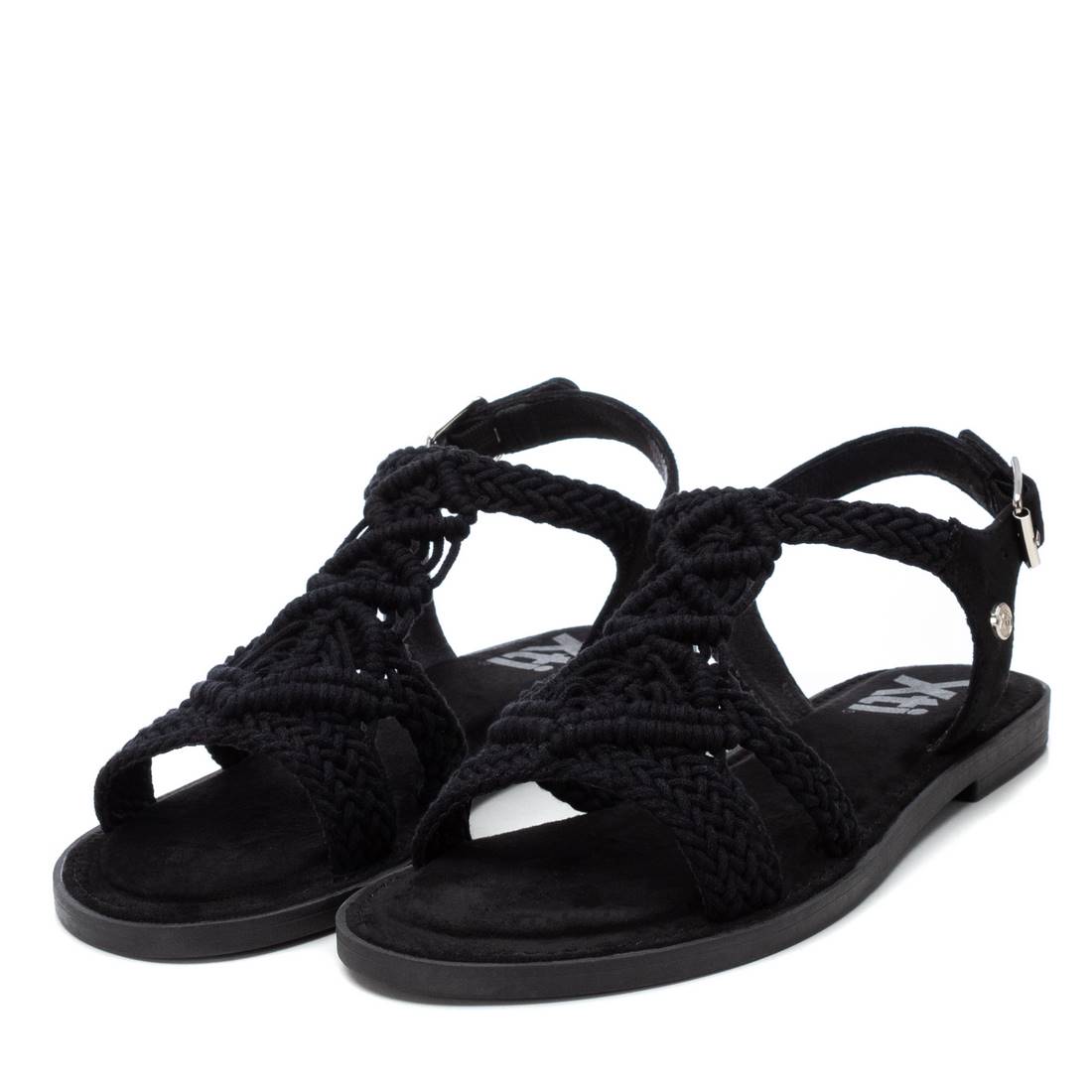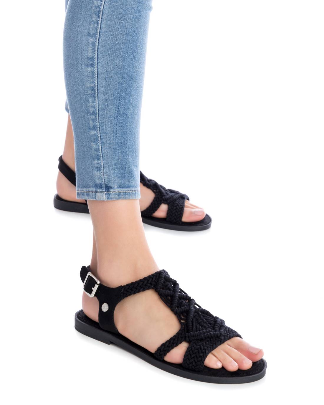 Women's sandals by Xti. Made in macramé style fabric. Rear bracelet made of material that imitates leather with buckle on the side to fasten to the ankle. Non-slip rubber sole. This model has been certified vegan by the worldwide organisation PETA (Animal Rights Organisation).