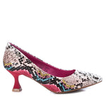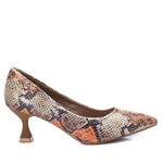 Women's shoe, Mule type, XTI brand. With 5 cm high heel with non -slip rubber lid. Manufactured in material that mimics snake skin. Return to the great parties with these heels trend this season. This model has obtained the vegan certificate by the PETA World Organization (organization of animal rights).