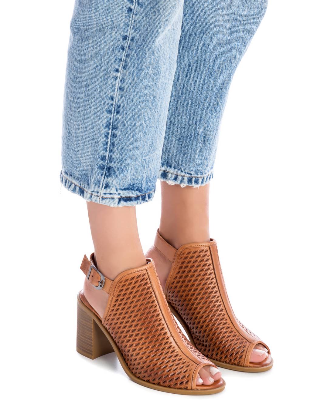 Sandalia abotinada de mujer, de la marca Carmela. Fabricada en piel de alta calidad con detalle calado con diseño geométrico. Tacón ancho de 9cm con suela antideslizante.