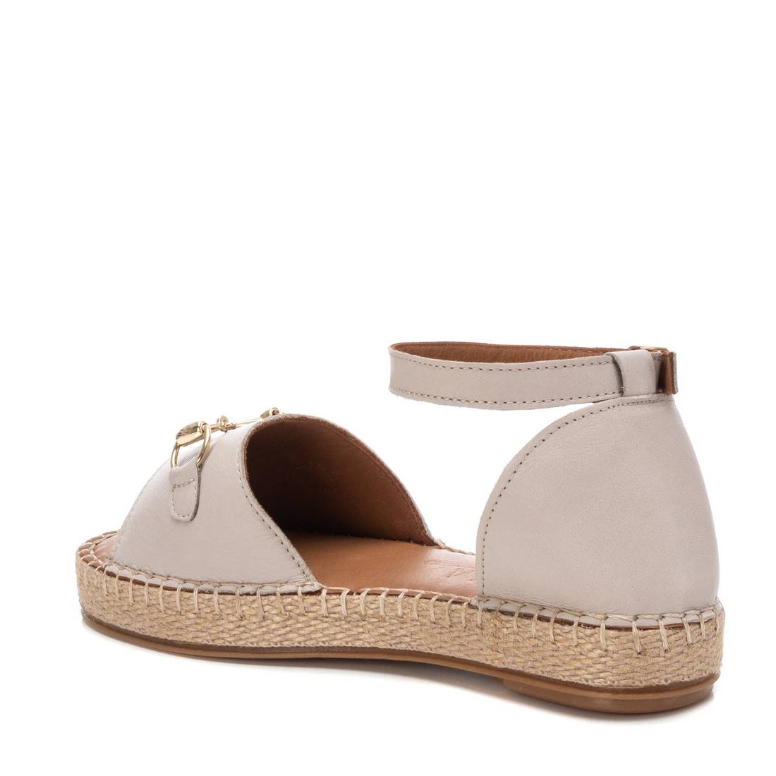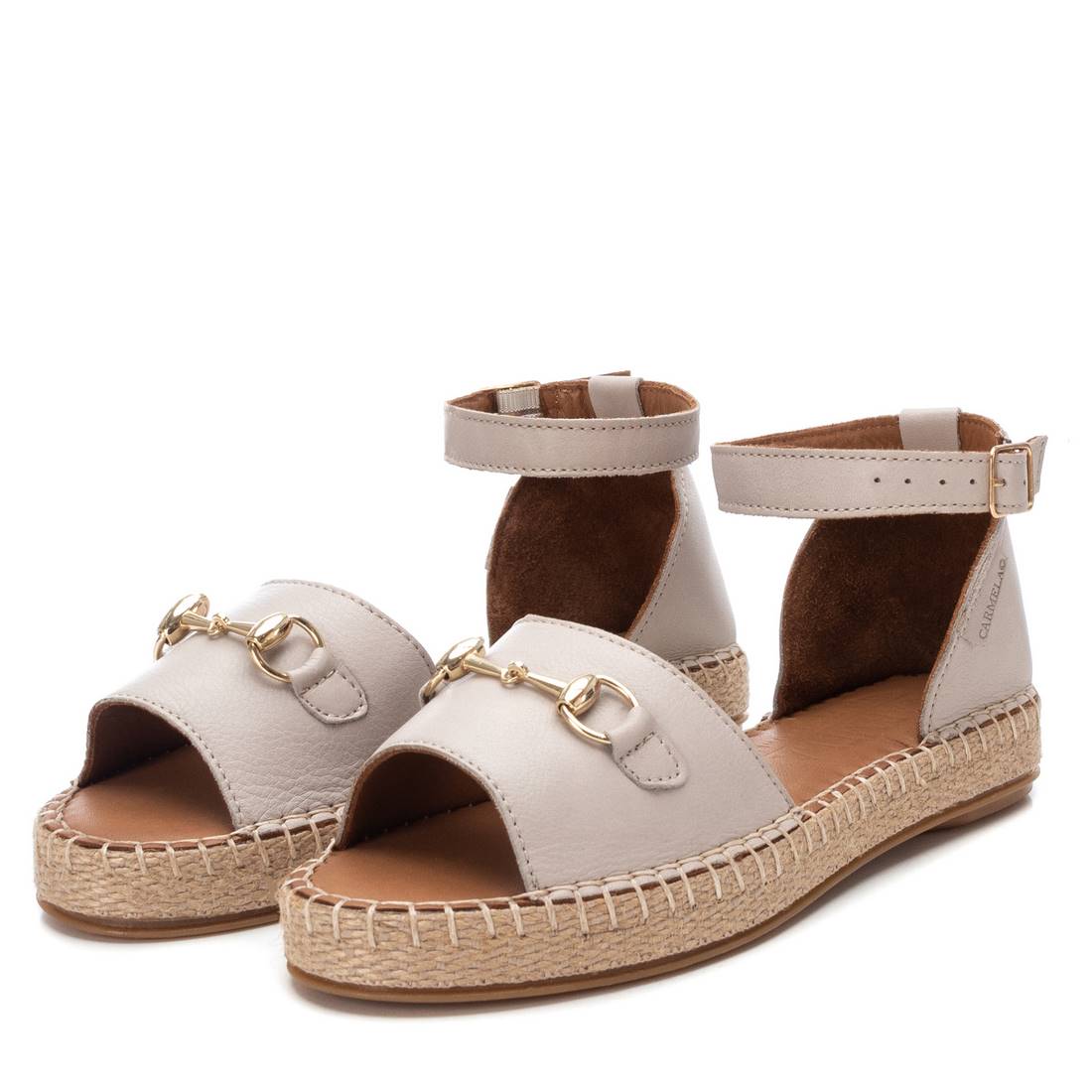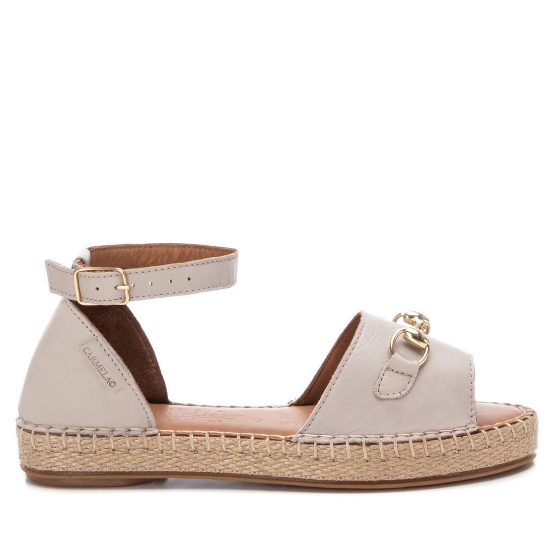 Sandalia de mujer, de la marca Carmela. Fabricada en piel de alta calidad. Detalle metalizado en el frente para un toque sofisticado. Correa al tobillo con hebilla metálica. Piso de yute con suela de goma antideslizante.