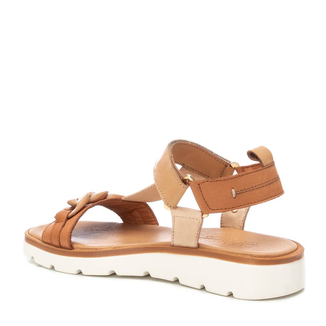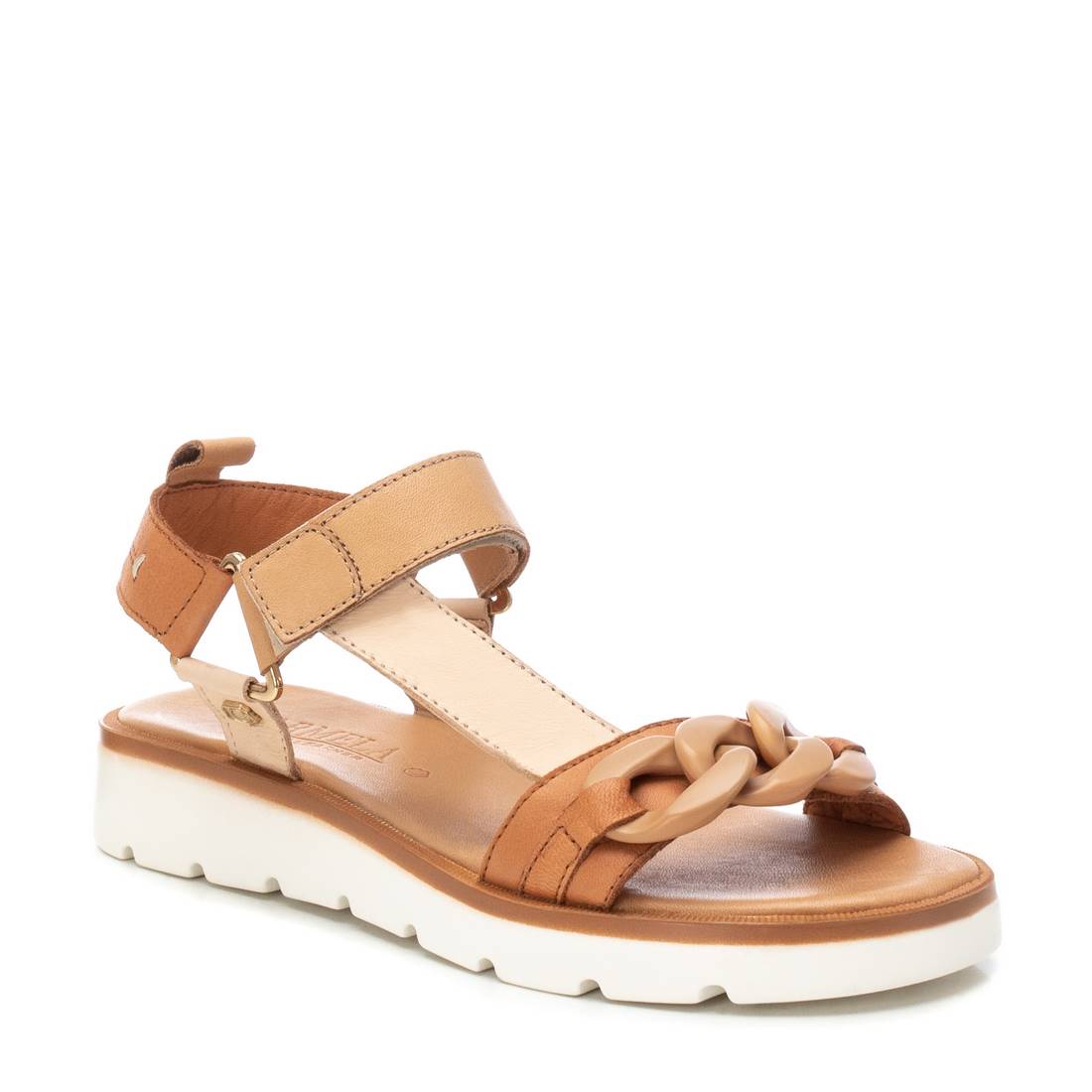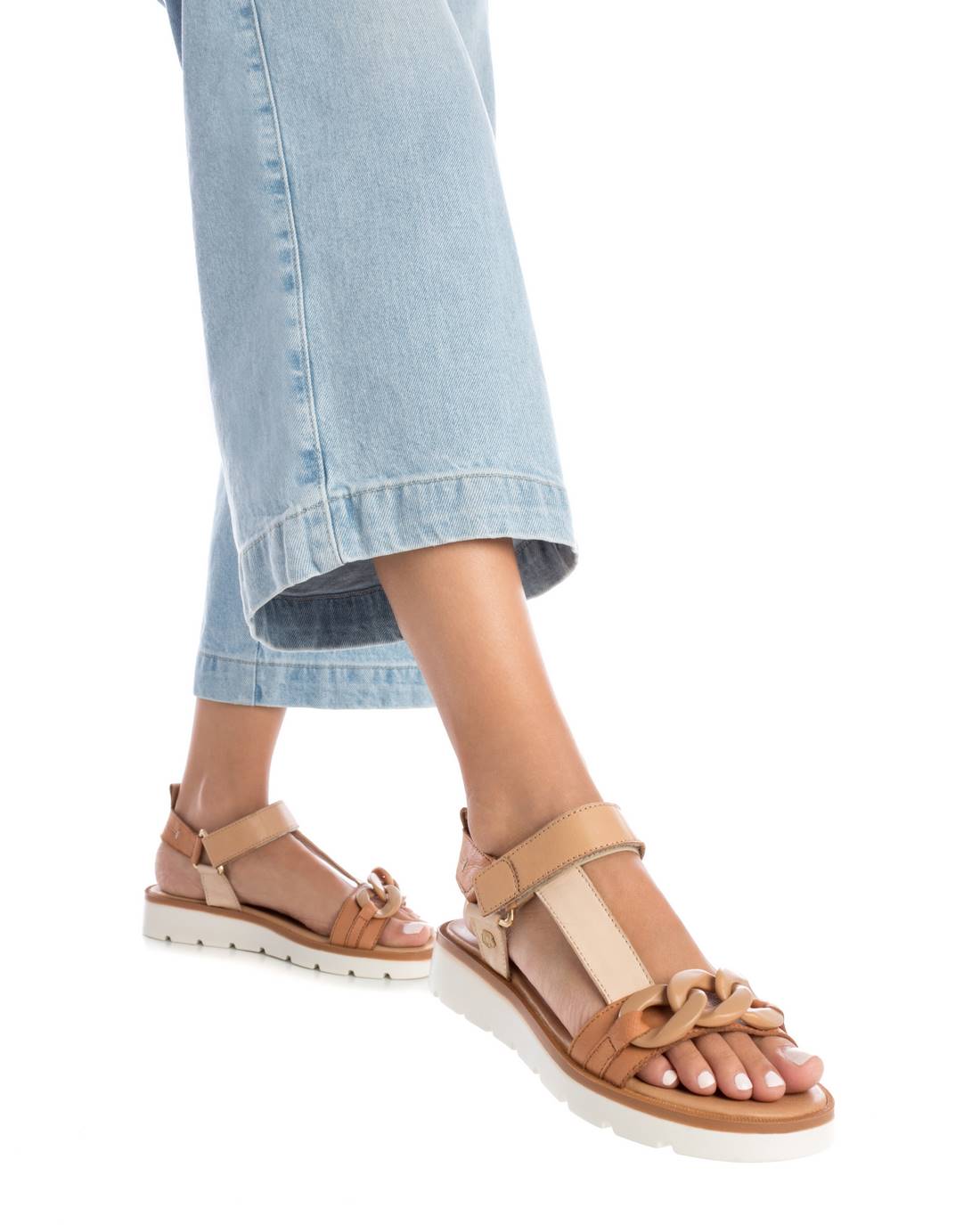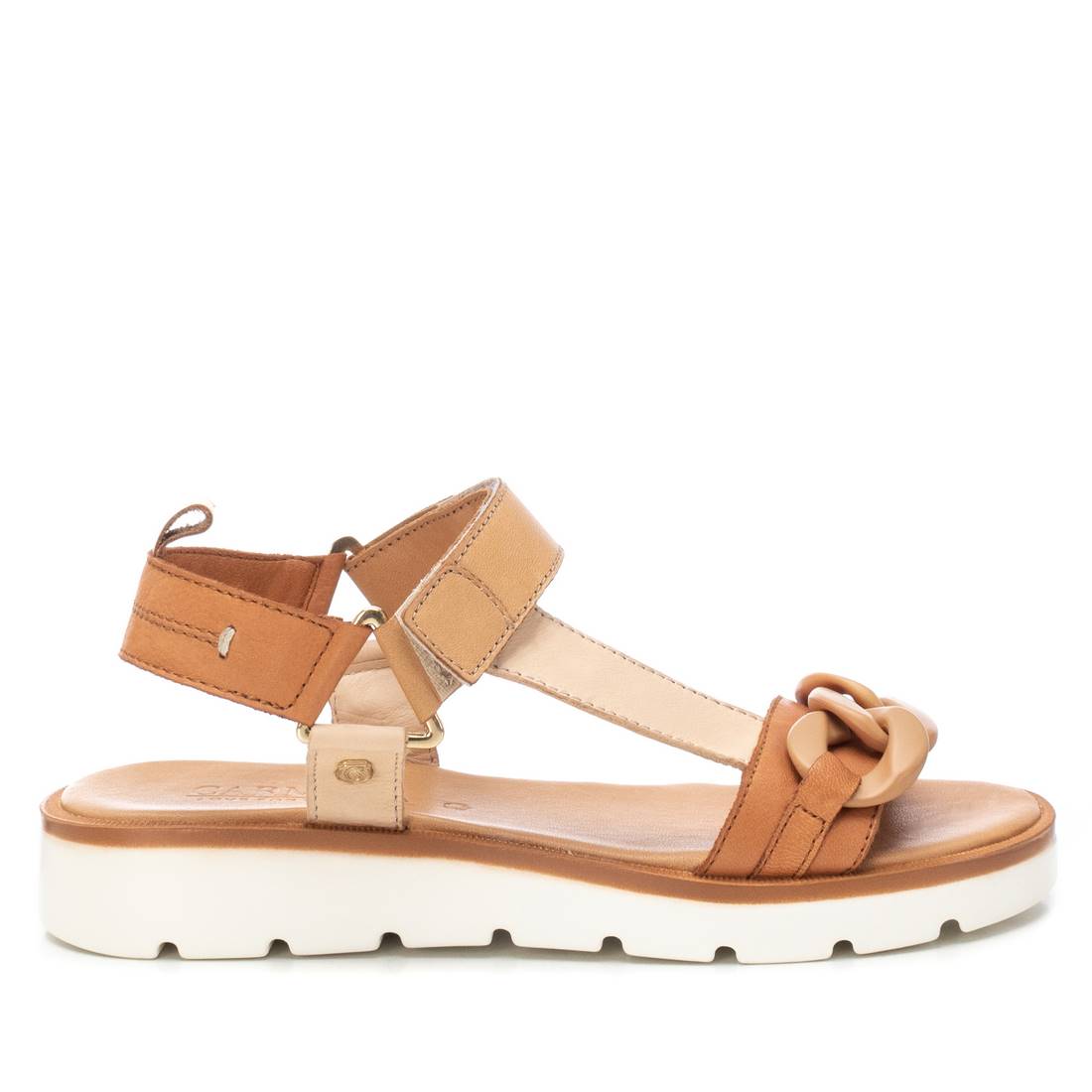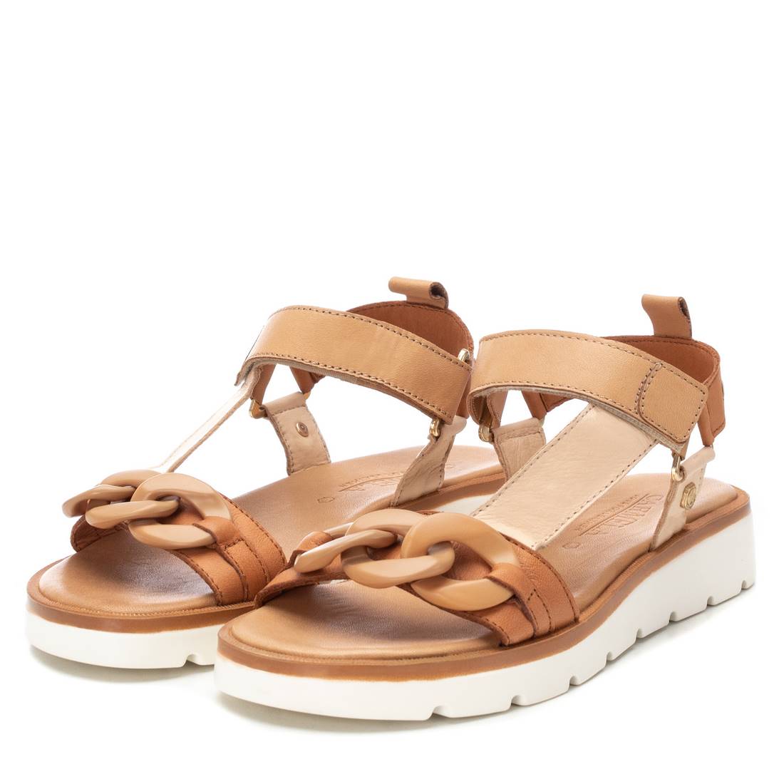 Sandalia de mujer, de la marca Carmela. Fabricada en piel de alta calidad. Diseño de T con cierre mediante tira adherente. Cadena decorativa al tono del modelo. Cómoda suela de goma antideslizante.