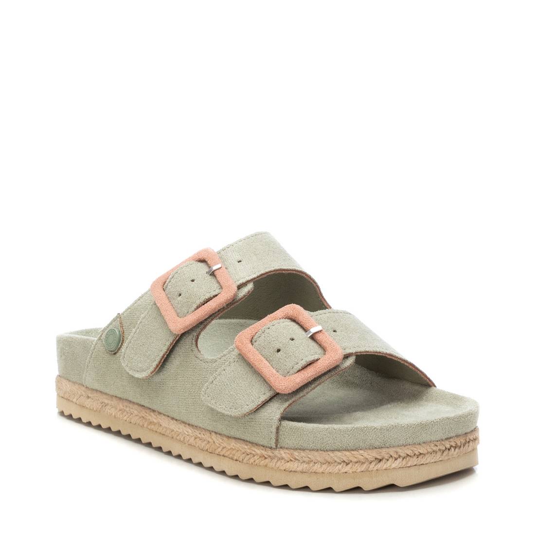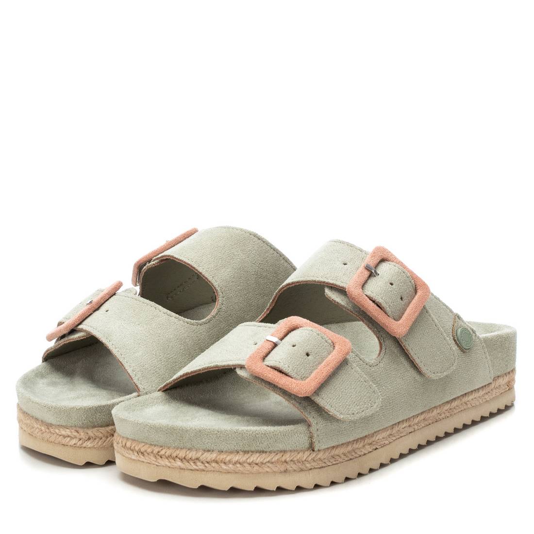 Sandalia de mujer, de la marcar Refresh. Fabricada en suave antelina. Modelo de pala doble con hebillas ajustables. Planta bios forrada en el mismo material. Piso de yute trenzado y suela dentada antideslizante. Este modelo ha obtenido el certificado vegano por la organización mundial PETA (Organización de los derechos de los animales).