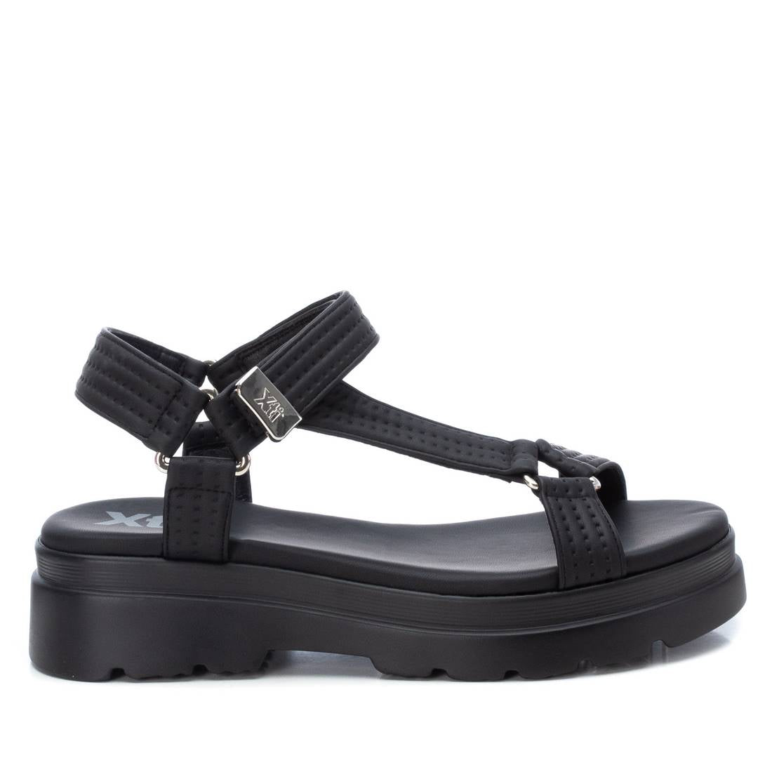 Sandalia plana de mujer, de la marca Xti. Fabricada en material que imita la piel, de alta calidad. Detalle de bandas acolchadas y terminaciones metálicas, para un look más urbano. Cierre mediante tiras adherentes. Suela track de goma antideslizante. Este modelo ha obtenido el certificado vegano por la organización mundial PETA (Organización de los derechos de los animales).
