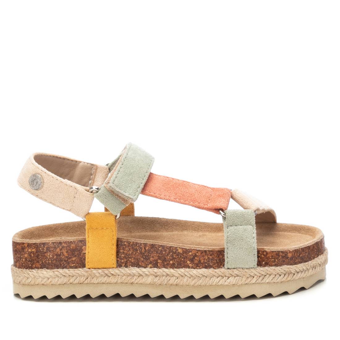 Sandalia multicolor de niña, de la marca Xti Kids. Fabricada en suave antelina. Cierre mediante tira adherente. Plataforma rodeada por tira de yute con suela de goma antideslizante. Una sandalia ideal para completar los looks más veraniegos esta temporada. Este modelo ha obtenido el certificado vegano por la organización mundial PETA (Organización de los derechos de los animales).