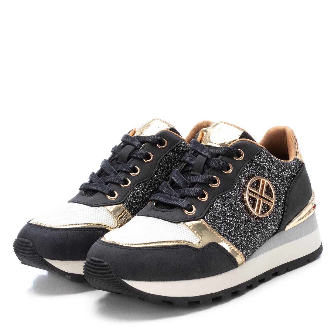 Zapatilla de mujer, de la marca Xti. Fabricada en material de glitter combinado con textil y material que imita la piel. Cierre mediante cordones. Pequeña cuña para mayor comodidad y suela de goma antideslizante. Este modelo ha obtenido el certificado vegano por la organización mundial PETA (Organización de los derechos de los animales).