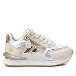 Zapatilla de niña, de la marca Xti Kids. Fabricada en material que imita a la piel combinada con tejido metalizado. Cremallera lateral con función para facilitar la puesta y cordones regulables para un mejor ajuste. Con gruesa suela de goma antideslizante. Este modelo ha obtenido el certificado vegano por la organización mundial PETA (Organización de los derechos de los animales).